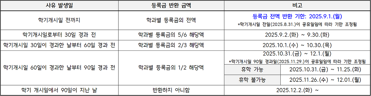 ※ 휴학은 11.25.(화)(수업개시일 3/4이내)까지 가능, 11.26.(수) ~ 12.1.(월) 기간 중에는 그 외 학적변동 발생 시 등록금 반환기준에 따라 반환됨.
