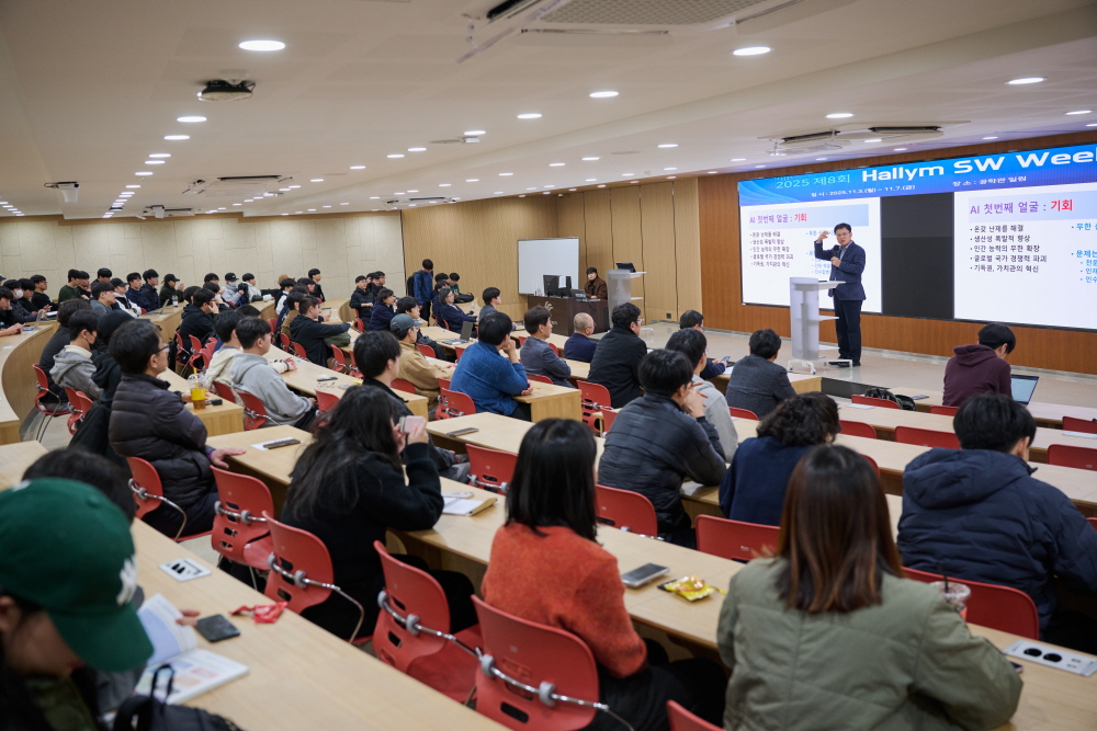 최양희 총장은 2025년 11월 3일(수) 본교 공학관에서 열린 2025 제8회 Hallym SW Week에 참석해 환영 인사와 함께 'AI의 두얼굴, 국가의 역할'이라는 주제로